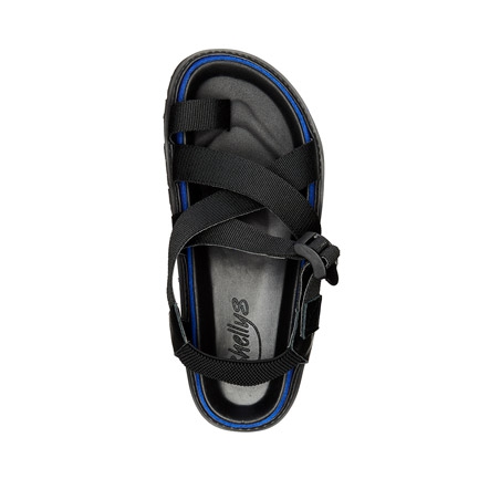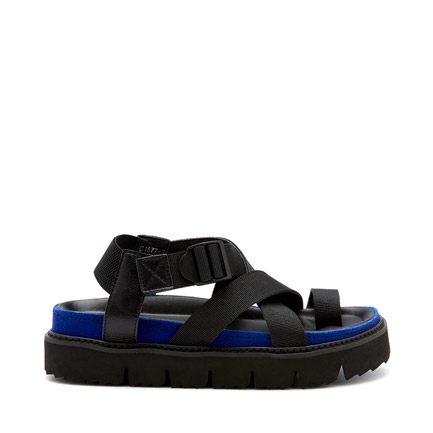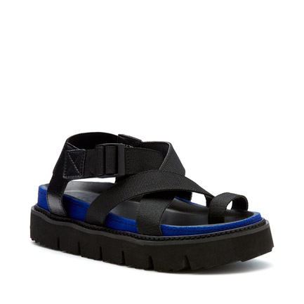 Amplify and ground your fresh season look with the Quaid sandals. Chunky, structured and bold, these high-impact sandals bring elements of streetwear into a wearable everyday design. The comfortable flatform style features quality wraparound straps with leather-look trims and an elasticated two-way stretch ankle band. Cool and contemporary, they feature an electric blue felt trim.