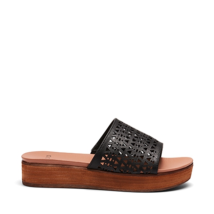 A beautiful addition to your summer sandals collection. The Bodhi slip-on sandals are a beautiful style for a lover of comfort and interesting detail. The minimal flatform style has a wooden stacked sole and leather-look upper. The design features mini cut-work patterns to add to the summer boho feel. Synthetic Upper, Lining and Outsole.